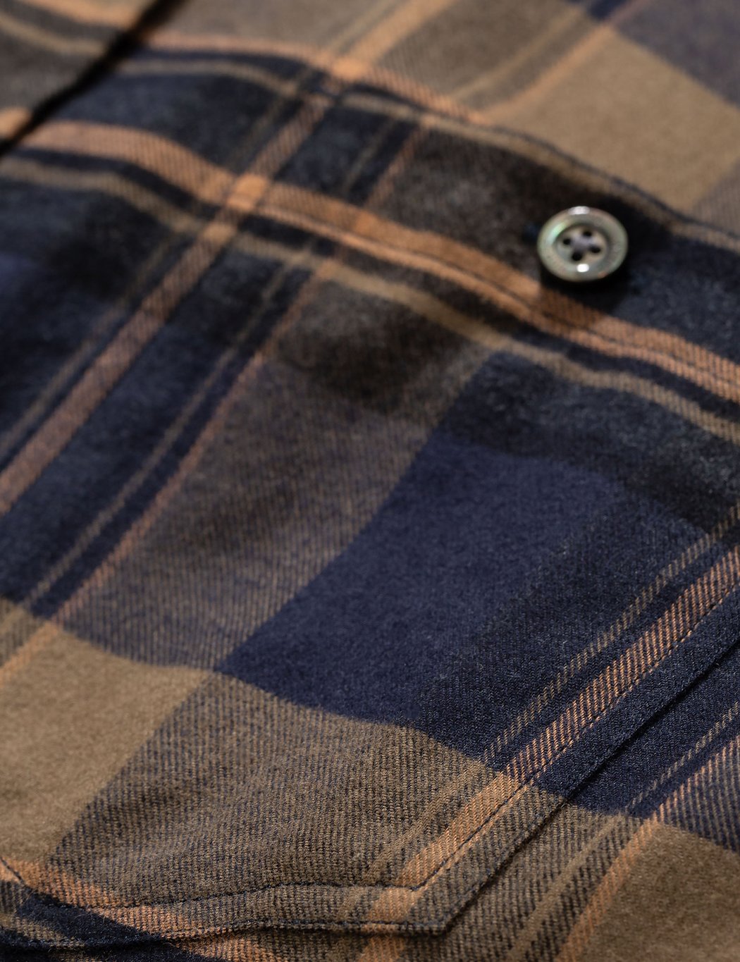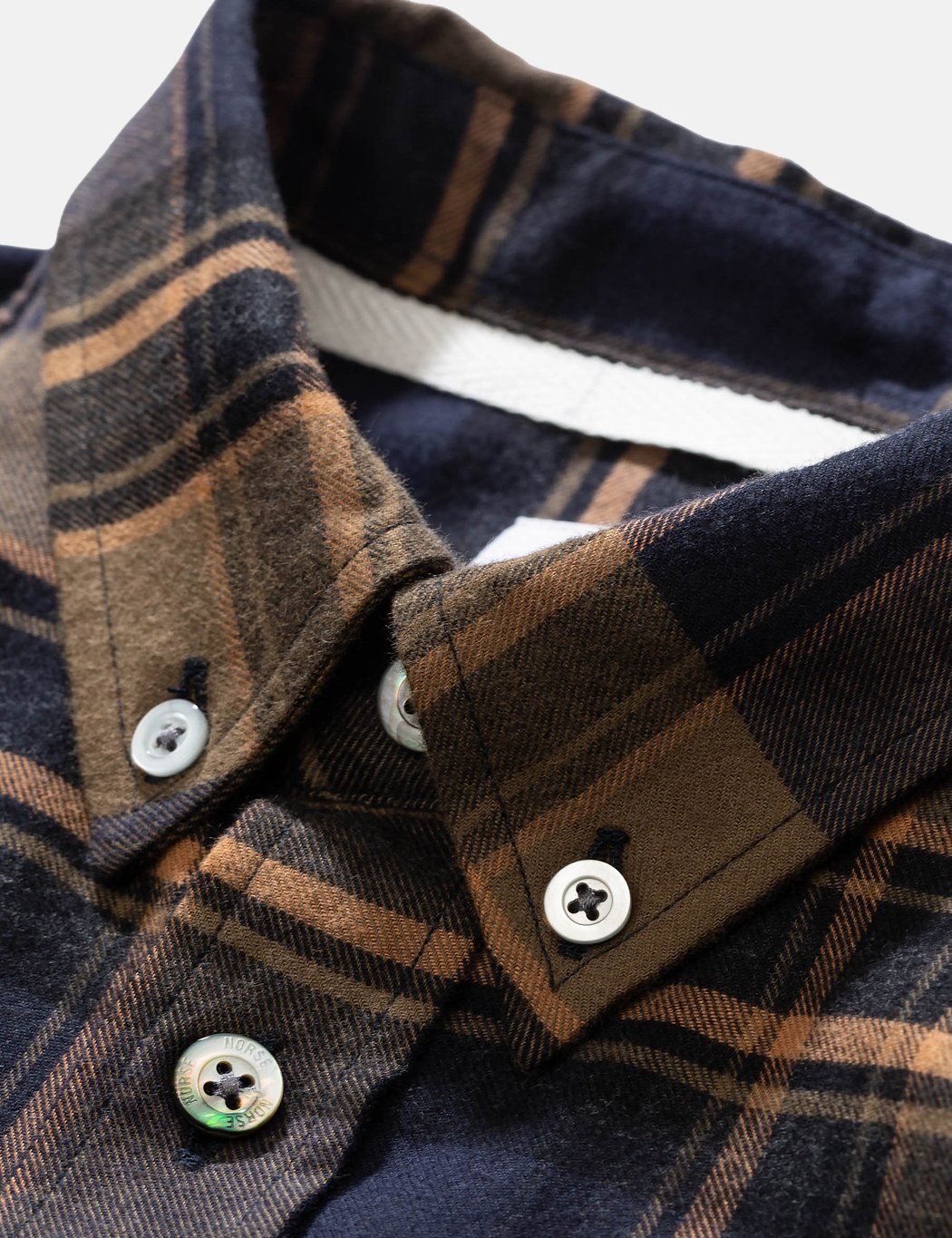 Button down shirt made in brushed flannel. The woven melange yarns give a soft textured feel. Features include mother of pearl buttons and one button-closure chest pocket. Higher top button on placket, allowing the top button to be undone while still maintaining a clean look.