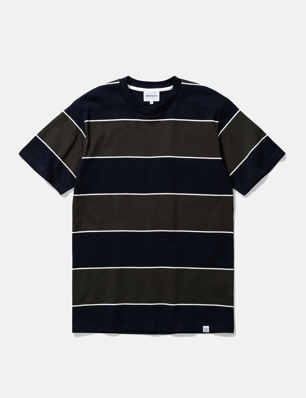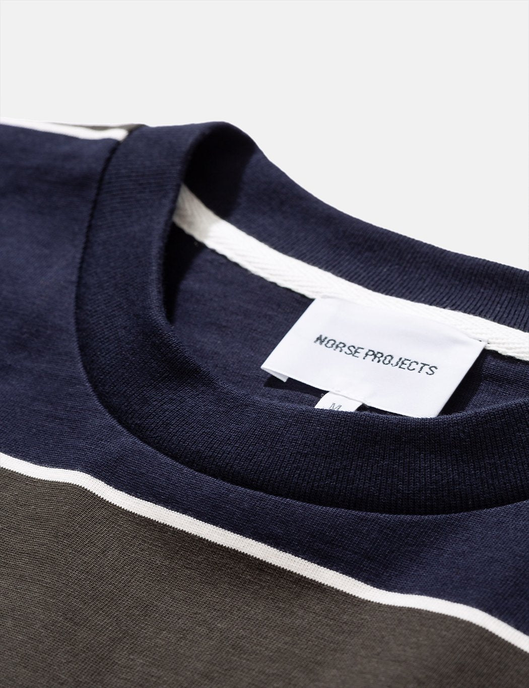 The Norse Johannes is a relaxed fit short-sleeved jersey with wide stripes in bright colours. Cut from a rugged jersey this style is inspired by a stripe repeat, which often appears in classic sportswear. Features a self-fabric collar and minimal stitching.