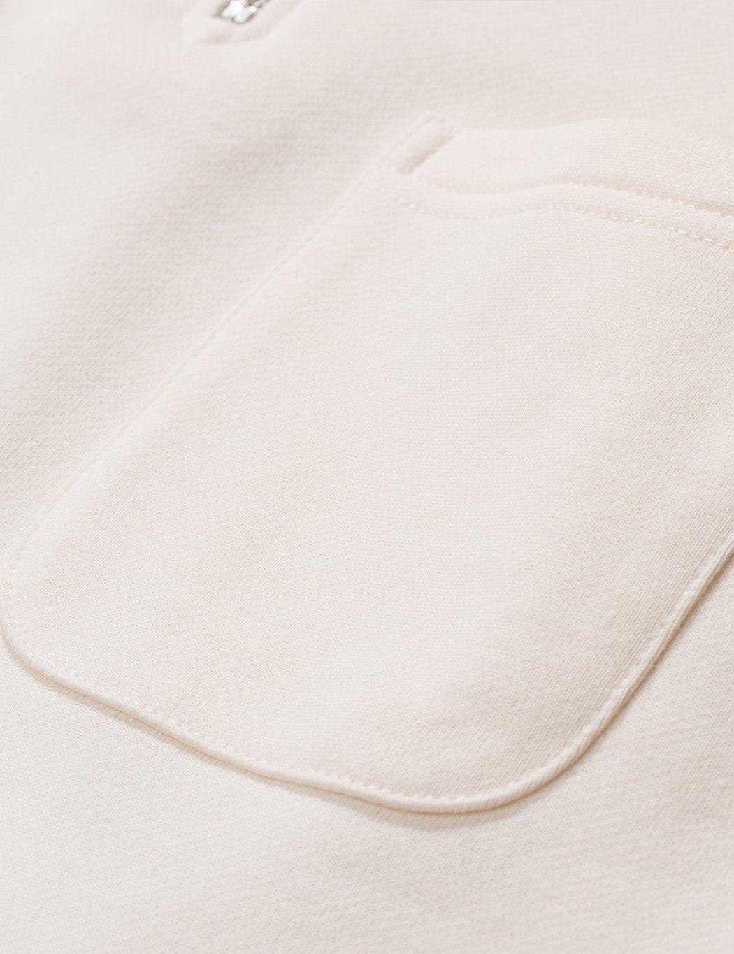 Jorn is a half zip sweatshirt inspired by varsity track sweats. It features one patch pocket on the chest, zip up neck placket and ribbed cuffs and side split hem.