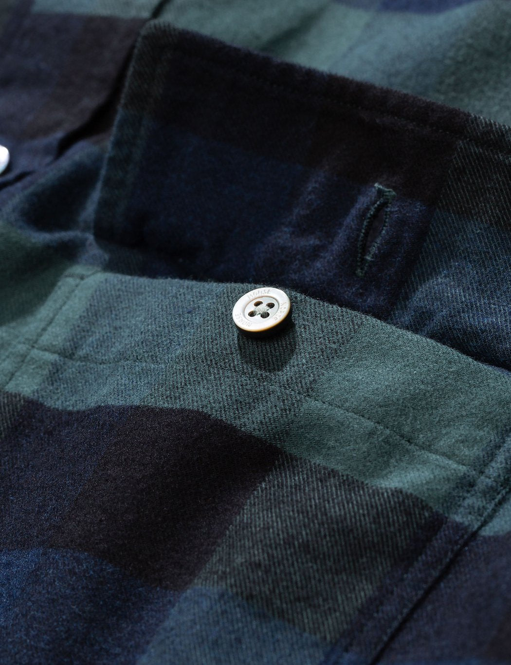 A classic button-down shirt made from a light flannel in a classic check design, brushed to add subtle texture and a soft handfeel. Features include mother of pearl buttons and one button-closure chest pocket. Higher top button on placket, allowing the top button to be undone while still maintaining a clean look.
