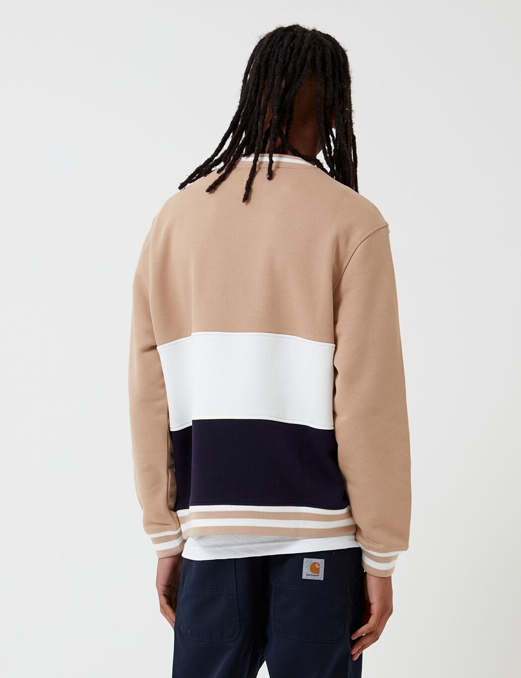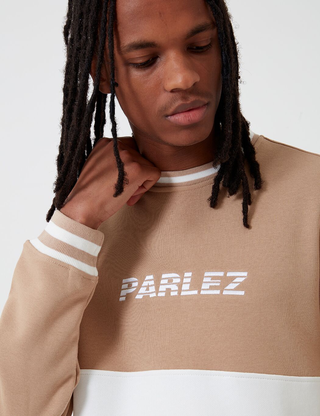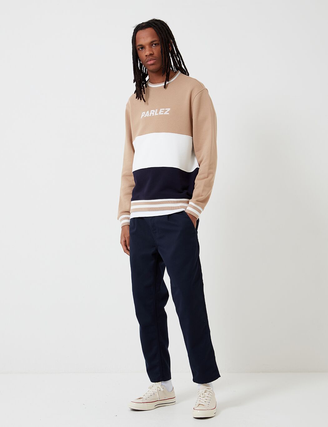 Abeking Parlez crew neck sweatshirt featuring sand, white and navy blue panelling, Parlez signature embroidery on centre chest and finished with tipped cuffs, hem, and neck.