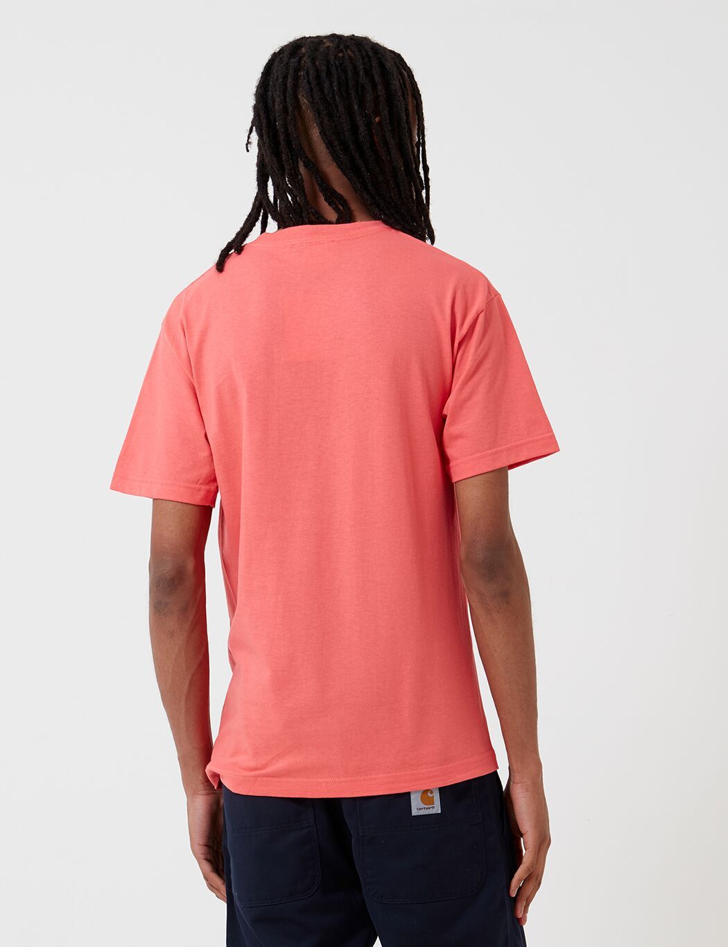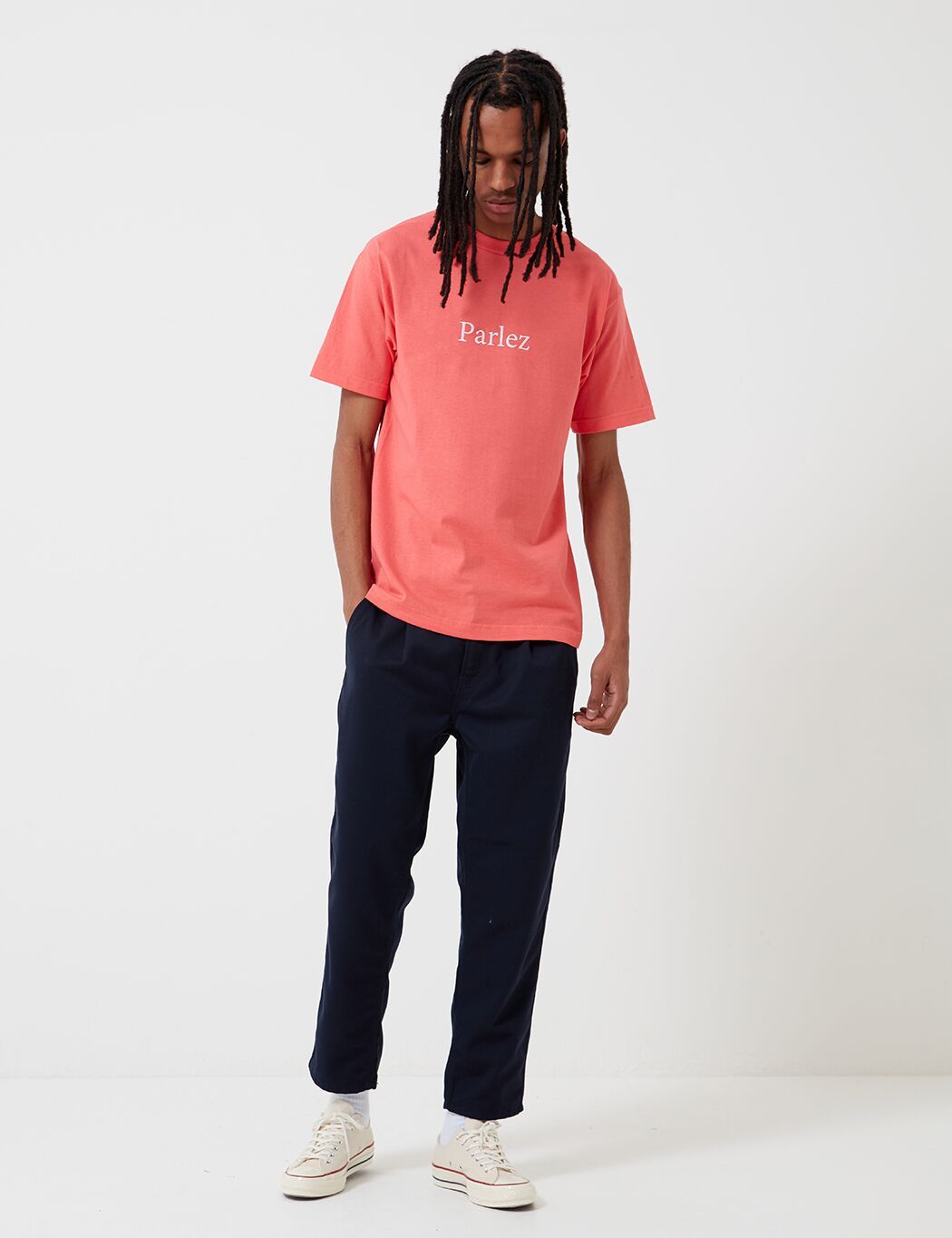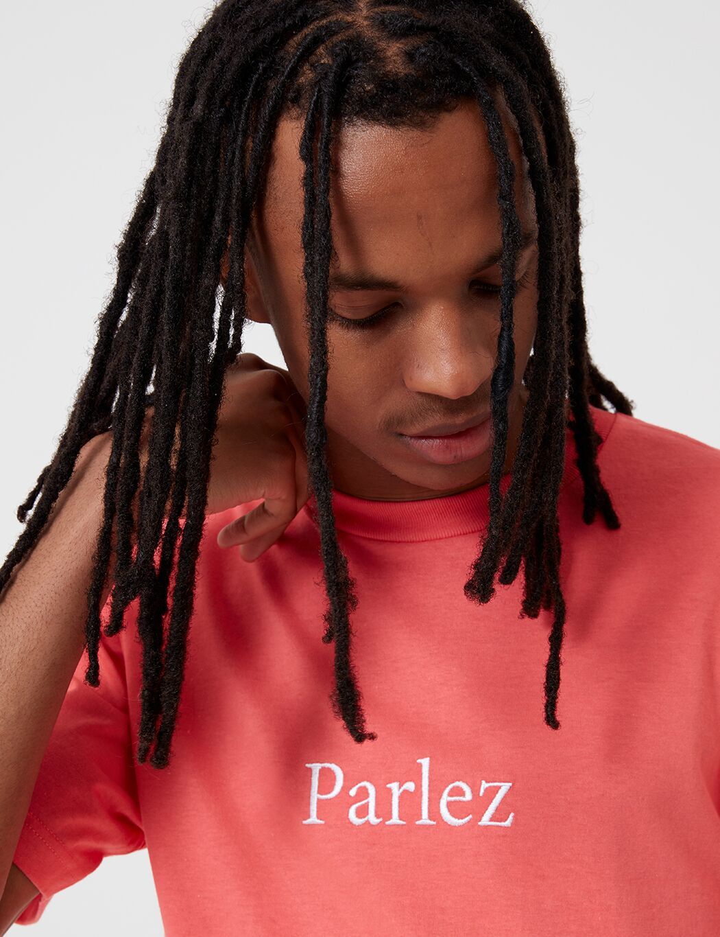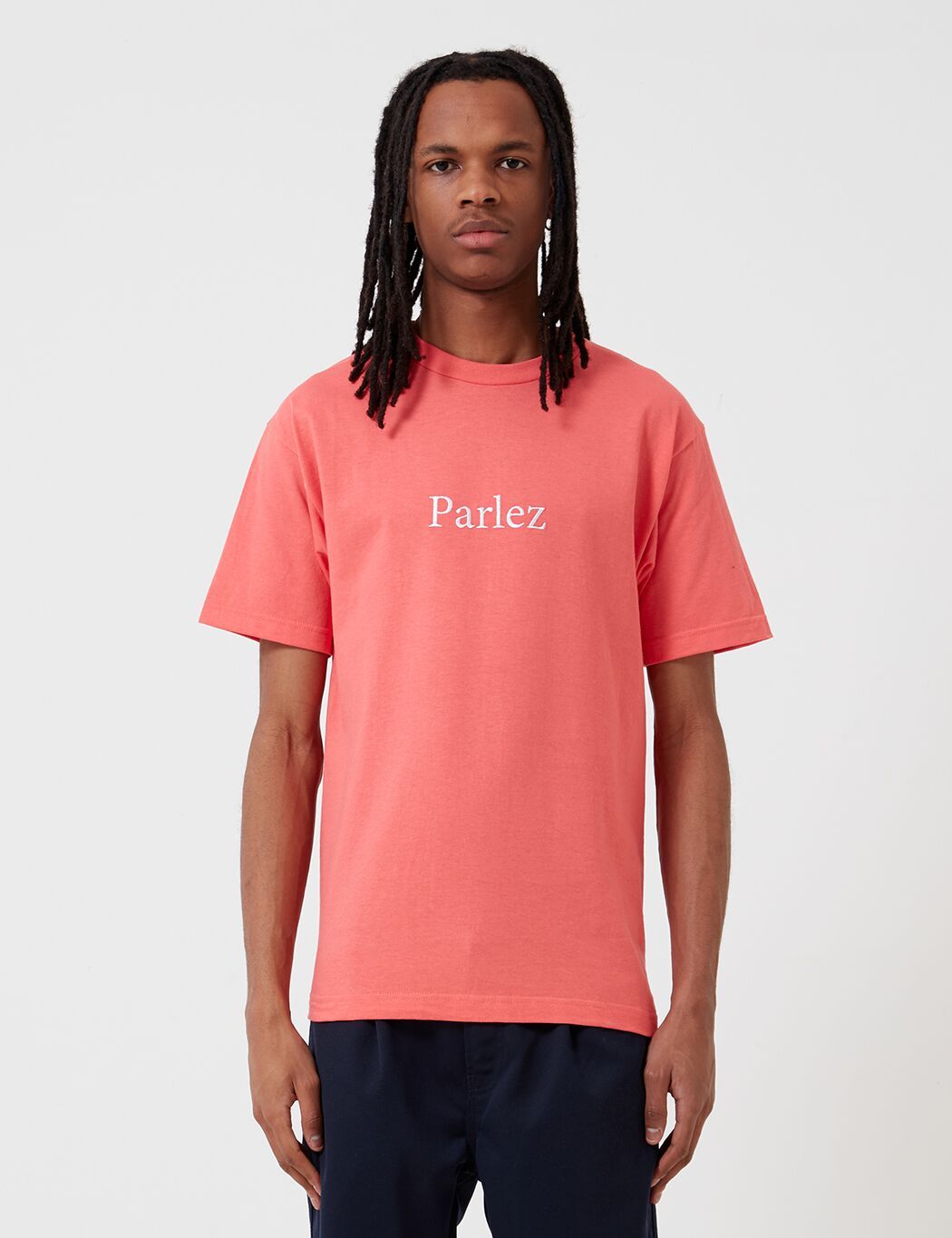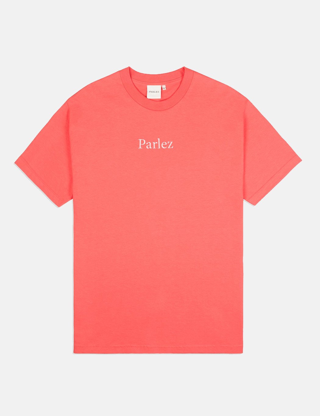 The Parlez Skutsje t-shirt in vibrant coral features classic Parlez embroidery branding centred on the chest in a white contrast. Heavy weight t-shirt in regular fit.